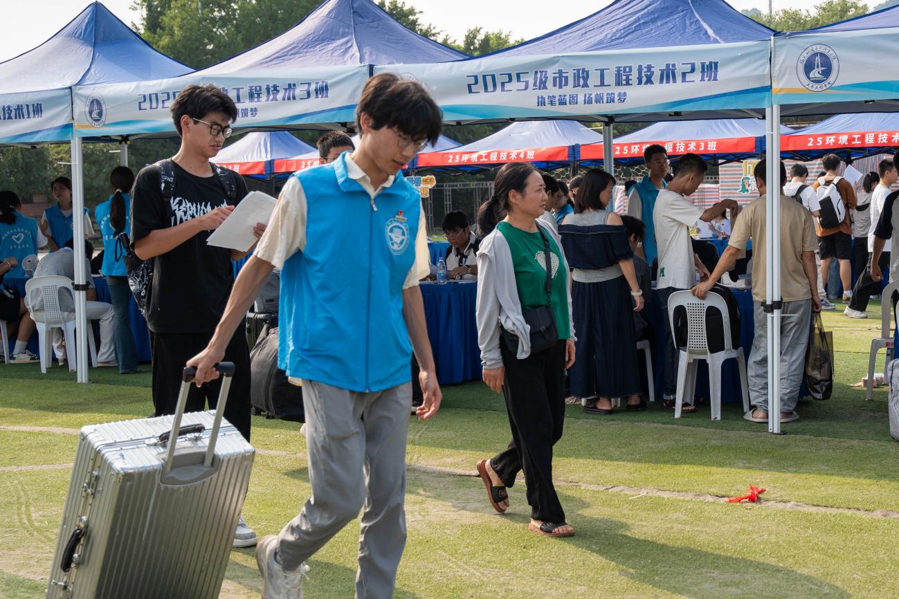 為保障迎新平穩(wěn)有序,學(xué)院提前啟動(dòng)全方位籌備:精心研討打磨福船園飛揚(yáng)田徑場(chǎng)的場(chǎng)地規(guī)劃、功能分區(qū),反復(fù)推演并優(yōu)化新生報(bào)到流程,力求為2025級(jí)新生打造高效暖心的入學(xué)體驗(yàn)。迎新當(dāng)天,校園彩旗招展,迎新橫幅與指引牌清晰醒目。志愿者身著統(tǒng)一服裝早早到位,熱情地為新生們提供引導(dǎo)服務(wù),搬運(yùn)行李,從信息登記、材料核驗(yàn)到護(hù)送至宿舍全程陪伴,用貼心服務(wù)化解新生陌生感,讓他們初入校園便感受家的溫暖。