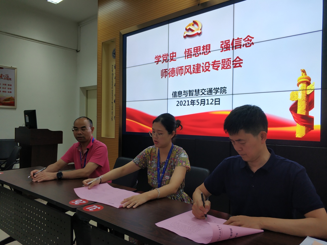 會(huì)上,學(xué)院總支書記許友孝帶領(lǐng)全體老師們認(rèn)真閱讀了《信息與智慧交通學(xué)院師德師風(fēng)承諾書》的各項(xiàng)內(nèi)容,強(qiáng)調(diào)堅(jiān)決不觸碰師德紅線,做一個(gè)遵守紀(jì)律的老師。最后每位老師鄭重地在《信息與智慧交通學(xué)院師德師風(fēng)承諾書》上簽下了自己的名字。
