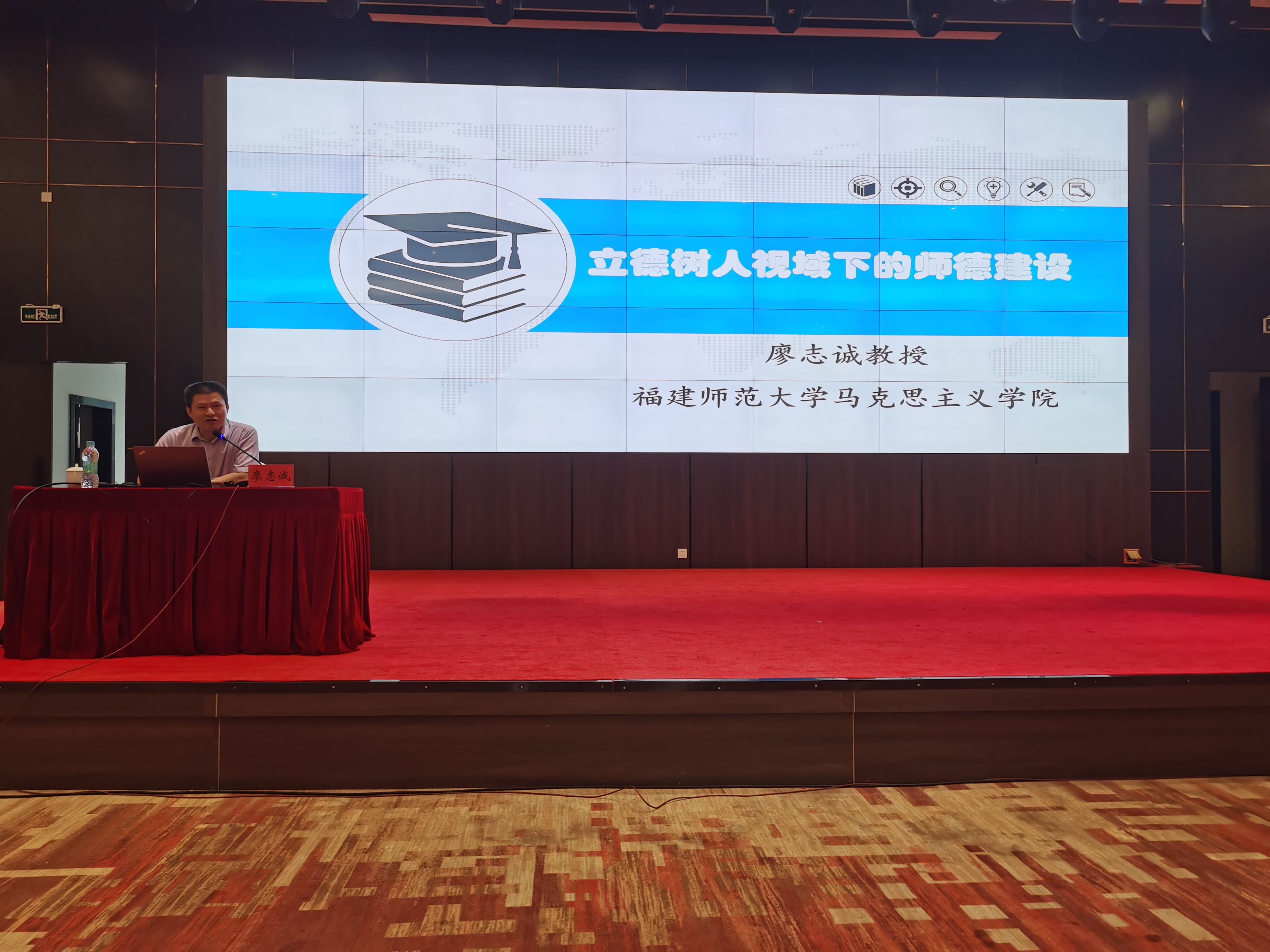 福建師范大學(xué)馬克思主義學(xué)院教授、法學(xué)博士、碩導(dǎo)、思想政治教育專(zhuān)業(yè)碩士點(diǎn)學(xué)科帶頭人廖志誠(chéng)以《立德樹(shù)人視域下的師德建設(shè)》為題,從師德建設(shè)的目標(biāo)、任務(wù)、關(guān)鍵等入手全面分析了新時(shí)代立德樹(shù)人對(duì)師德的基本要求,通過(guò)理論分析、案例分享對(duì)如何在立德樹(shù)人視域下推進(jìn)師德建設(shè)進(jìn)行了解讀,為我校進(jìn)一步推進(jìn)師德師風(fēng)建設(shè)具有積極意義。