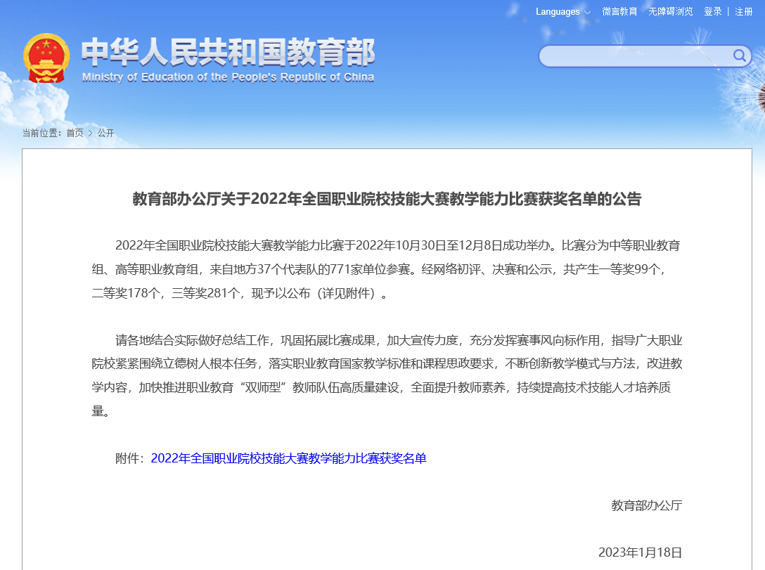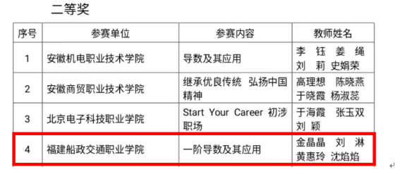 2023年1月18日,教育部辦公廳公布由教育部主辦,代表全國職業(yè)院校教學(xué)能力最高水平的權(quán)威賽事--2022年全國職業(yè)院校技能大賽教學(xué)能力比賽獲獎名單。我校通識教育學(xué)院金晶晶、劉淋、黃惠玲、沈焰焰教學(xué)團隊的作品《一階導(dǎo)數(shù)及其應(yīng)用》榮獲二等獎。