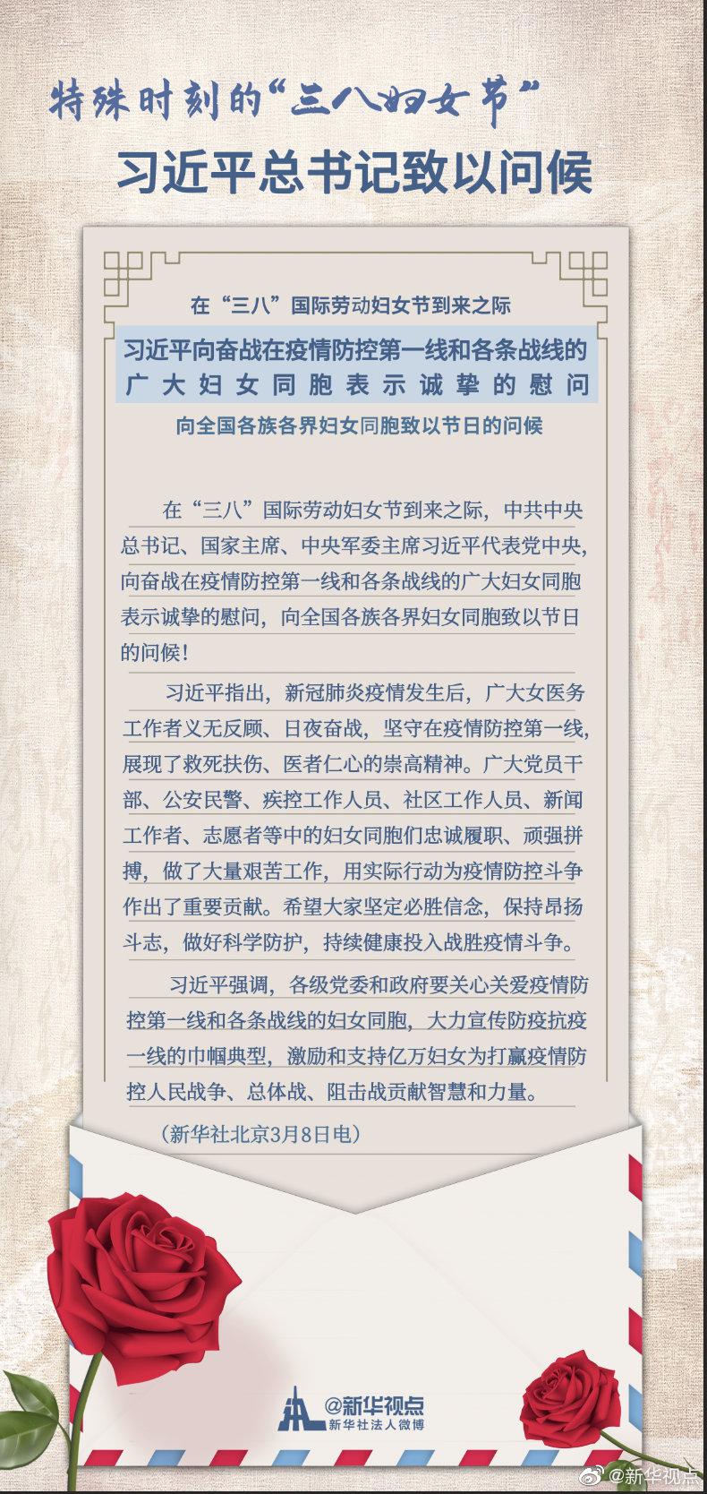 新華社北京3月8日電 在“三八”國(guó)際勞動(dòng)?jì)D女節(jié)到來之際,中共中央總書記、國(guó)家主席、中央軍委主席習(xí)近平代表黨中央,向奮戰(zhàn)在疫情防控第一線和各條戰(zhàn)線的廣大婦女同胞表示誠(chéng)摯的慰問,向全國(guó)各族各界婦女同胞致以節(jié)日的問候!