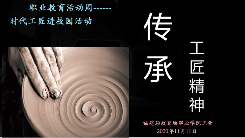 為進一步營造全社會關心支持職業(yè)教育的良好氛圍,積極參與學院2020年職業(yè)教育活動周,校工會于11月11日周三下午在教職工活動中心開展“時代工匠進校園”活動,特別邀請福建省非物質(zhì)遺產(chǎn)陶瓷藝術傳承人盧佳倫大師到校開展講座并親自帶領大家感受陶藝文化生活。