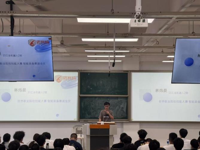 2025年世界技能大賽金獎(jiǎng)獲得者、我院23級(jí)工業(yè)機(jī)器人專(zhuān)業(yè)學(xué)生林煒晨分享了他的備賽歷程與成長(zhǎng)體會(huì)。他提到,在機(jī)器人競(jìng)賽團(tuán)隊(duì)中系統(tǒng)性的訓(xùn)練,包括編程、算法學(xué)習(xí)與機(jī)器人反復(fù)拆裝等實(shí)戰(zhàn)內(nèi)容,不僅極大提升了其專(zhuān)業(yè)技能,更讓他明確了職業(yè)方向。他鼓勵(lì)新生充分了解學(xué)校提供的競(jìng)賽激勵(lì)政策,積極參與課外興趣小組,全面提升綜合能力。
