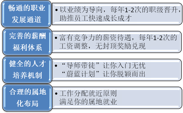 培訓(xùn)培養(yǎng) | 入職培訓(xùn)、導(dǎo)師帶徒、蔚藍(lán)計(jì)劃、e-Learning網(wǎng)絡(luò)學(xué)習(xí)、內(nèi)部培訓(xùn)、外送培訓(xùn)等 | |