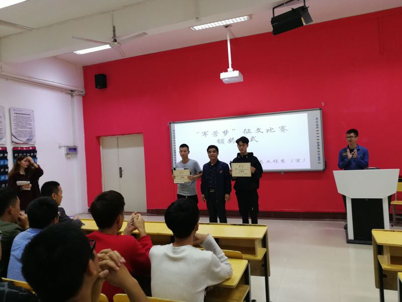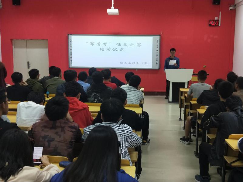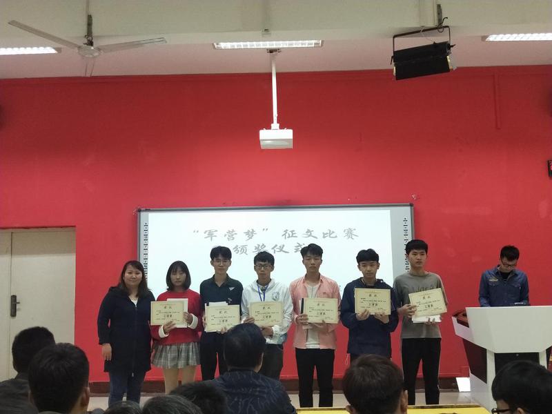頒獎儀式開始,主持人介紹了“軍營夢”征文比賽的得獎情況和評選活動情況,并向現(xiàn)場參加頒獎儀式的同學介紹了到場老師。隨后信息系系書記孫基老師發(fā)言宣布并恭喜得獎同學,然后由信息系系書記孫基老師為獲得一等獎的同學頒獎并發(fā)放獎品及獎狀,征兵負責人唐曉軍老師為獲得二等獎的同學頒獎并發(fā)放獎品及獎狀,“軍營夢”征文比賽負責人2017級輔導員黃華梅老師為獲得三等獎的同學頒獎并發(fā)放獎品及獎狀,頒發(fā)優(yōu)秀獎。隨后一起合影留戀記錄這光榮的一刻。