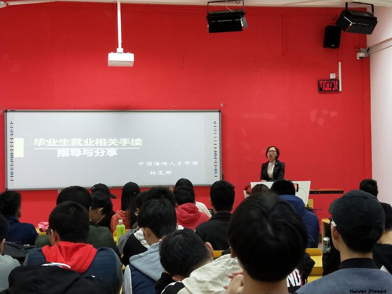 信息工程系于2018年11月14日中午12:00至下午13:00在北區(qū)2#1-5舉辦了信息工程系“畢業(yè)生就業(yè)指導與分享”講座,由中國海峽人才市場林嵐珊小姐主講。林小姐講到當前畢業(yè)生就業(yè)的幾大問題以及相關(guān)解決方法,說到畢業(yè)生就業(yè)的五個關(guān)鍵詞:1.檔案2.就業(yè)協(xié)議書3.報到證4.黨組織關(guān)系5.戶口遷移證。