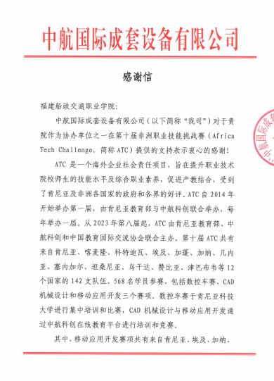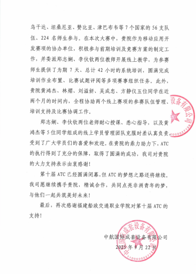 近日,由中航國際成套設(shè)備有限公司、肯尼亞教育部和中國教育國際交流協(xié)會聯(lián)合主辦的第十屆非洲職業(yè)技能挑戰(zhàn)賽(Africa Tech Challenge,簡稱“ATC”)圓滿落幕。我院信息與智慧交通學(xué)院師生團(tuán)隊(duì)全程護(hù)航移動應(yīng)用開發(fā)賽項(xiàng),以專業(yè)師資精準(zhǔn)授課、青年志愿暖心服務(wù),圓滿完成了線上培訓(xùn)與技術(shù)保障任務(wù),并獲主辦單位中航國際成套設(shè)備有限公司專函致謝。